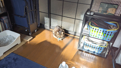 ついさっき、ボレちんに朝ご飯を与えておいて、それからなんやかんやしてパソコンデスクに着いたんだけども、 ふと見ると、いつも食後はキャットタワーてっぺんに登って外を監視(ニャルソックね)するか寝るかのボレロがどこにも居ない、 え?え?どこ行った?と思ったら、僕から向かって真後ろのとこに鎮座してました。