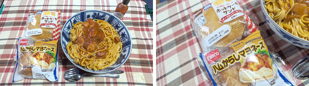 今日は、恐らく人生で初めてと言って良いくらいの取り合わせ、 パスタと菓子パンを夕食にしました。
