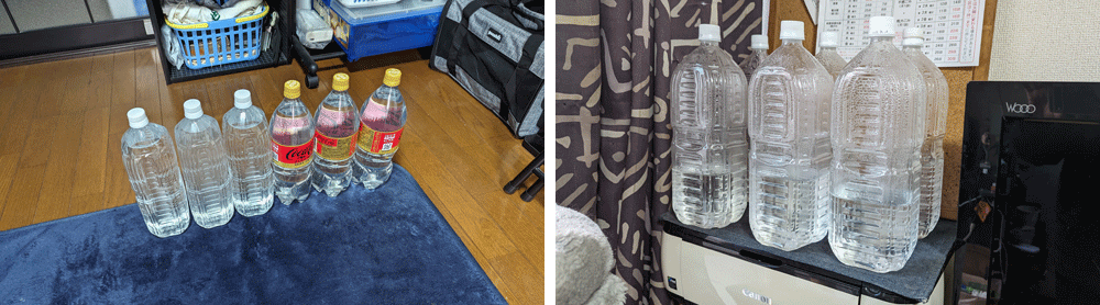 ラグをめくって引っかいたり、精密機器に乗って飛び降りる時に機械が揺れたりすんので、 こうしてペットボトルを並べてます。