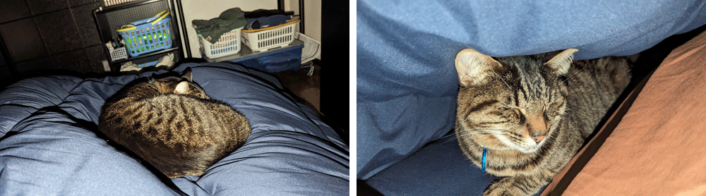 初めは僕の足元で寝始めて、寒くなってくると布団ん中に入って来ます。 そん時、僕が熟睡してる場合は、僕の頬をちょんちょんと突いて「中に入りたいんだけど」合図して来ます。 シアワセ過ぎて死にそうです。