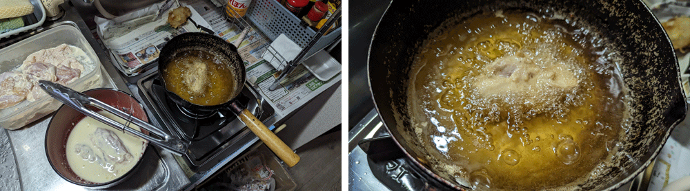 僕は揚げ物をやる時の、あの油がジュージュー→ぱちぱちする音がAMSRで、 そのため約4分がベストという鶏天の揚げ時間も全然苦にならず、敢えていっこずつ揚げて行きました。 今回は他の食材たちもあったんで、結局トータルで1時間くらい掛かっちゃいましたけども。
